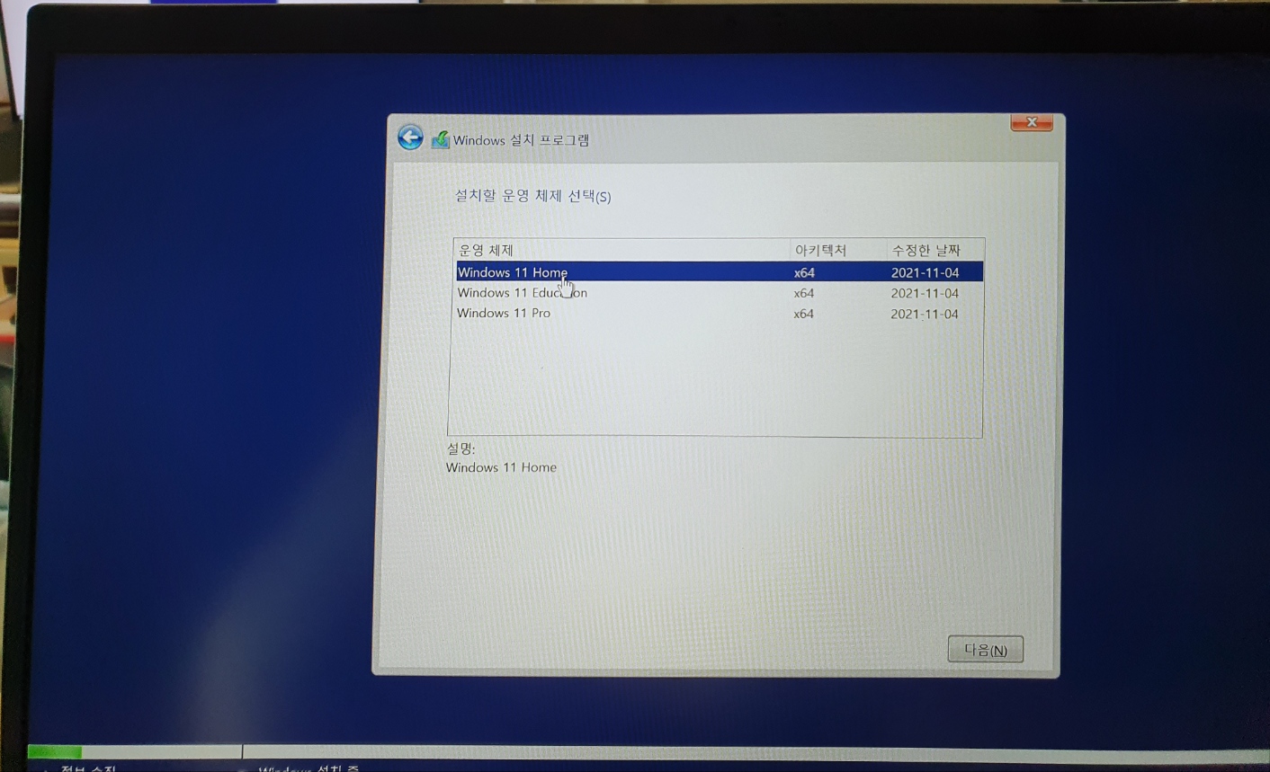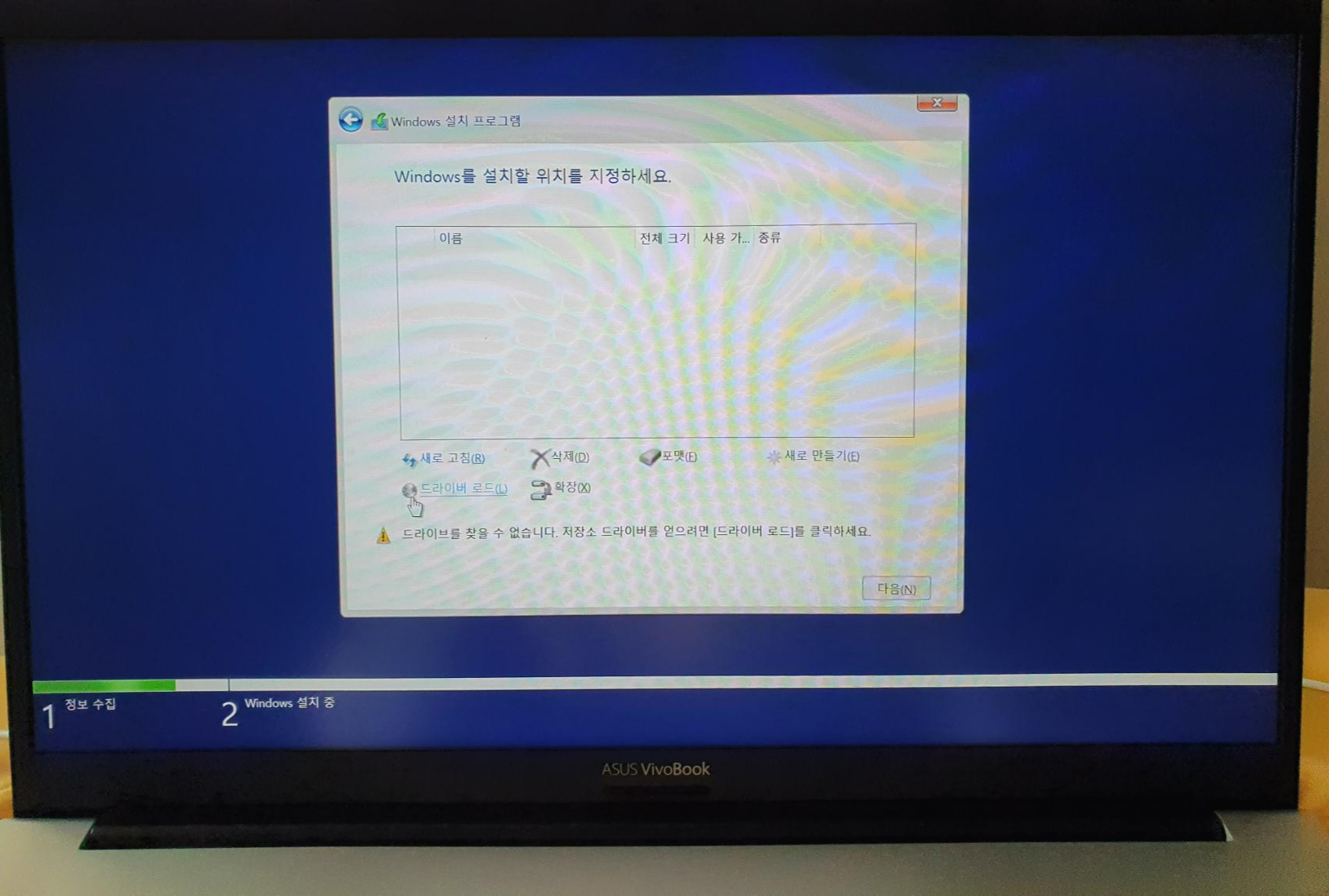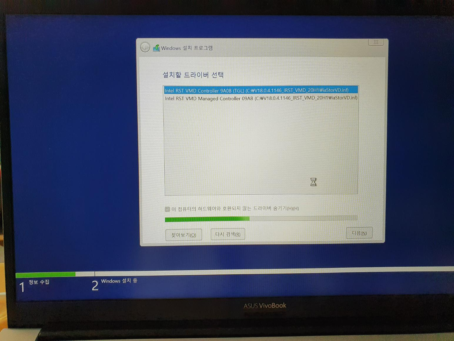 "Intel RST VMD Controller 9A0B...."로 되어있는 걸 체크해주시고 '다음' 버튼 누르면 저렇게 왼쪽 화면처럼 밑에 칸이 초록색으로 물들면서 갑니다. 그럼 그 중간에 있는 것처럼 나와요! 거기 중에 아무거나 선택해서 '다음' 눌러주시면 됩니다~ 저는 아직 탑재된 게 없어서 딱 하나밖에 안 나왔어요ㅎㅎ