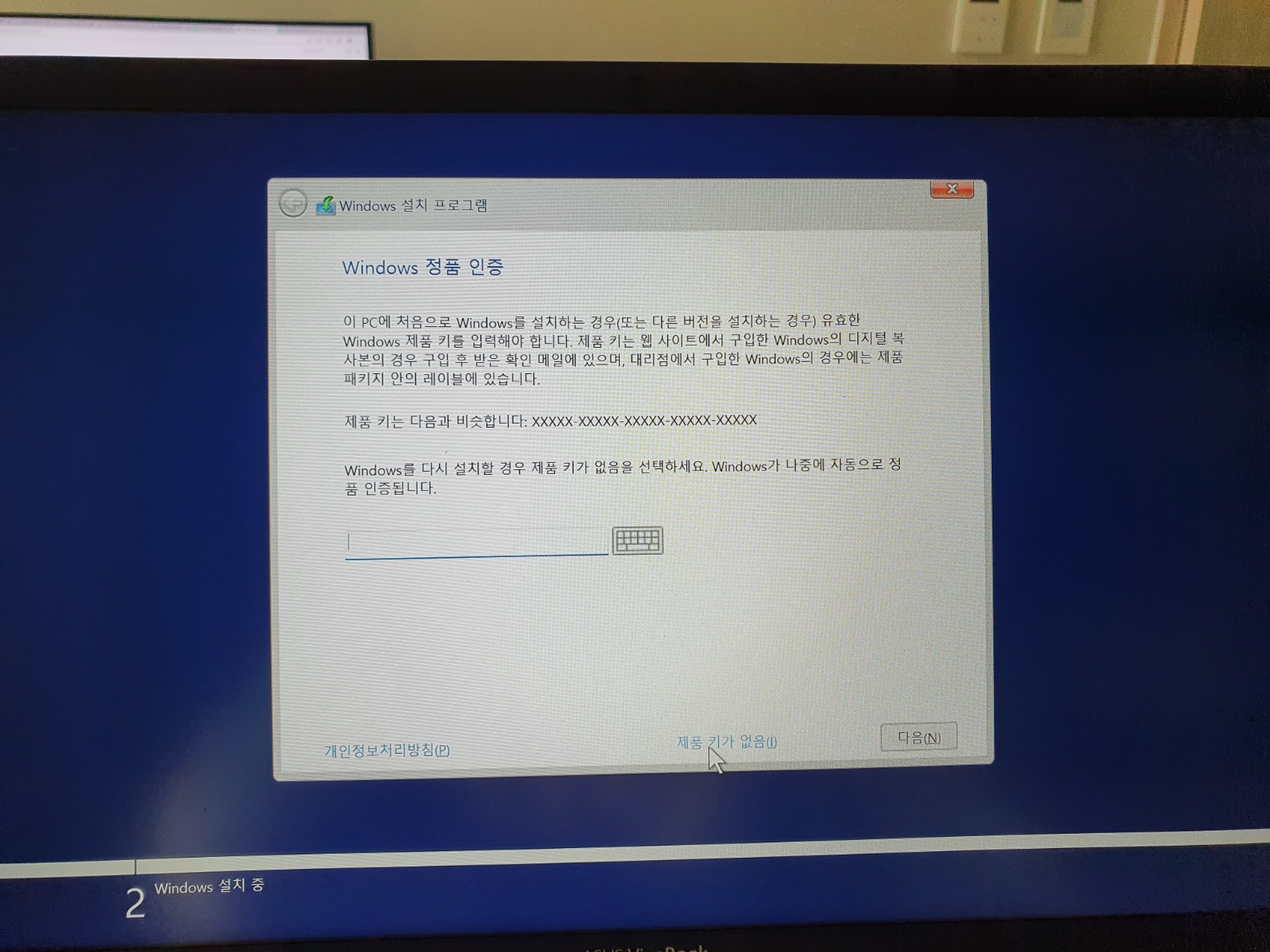 일단 저는 'pro' 선택했습니다, 그 후에 나오는 게 '정품 인증'하라고 나오는데, 제품 키 있으면 작성하시고, 지금 없다고 한다면 아래 ' 제품 키가 없음(I) '이라고 나와있는 걸 클릭하면 되요~ ' 다음(N) ' 이라고 쓰여있는 왼. 쪽에 위치해있어요! 지금 제품 키 작성 안 해도 윈도우 설치 후 시스템 들어가서 제품 키 쓰는 게 가능하니까요^^